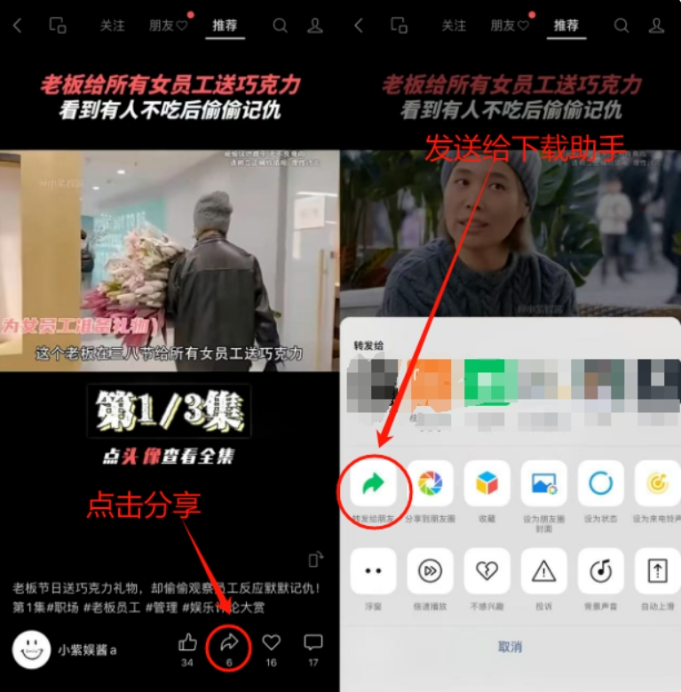 第二步:打开微信视频号的视频点击分享按钮,把自己要保存的视频分享给刚添加的下载助手